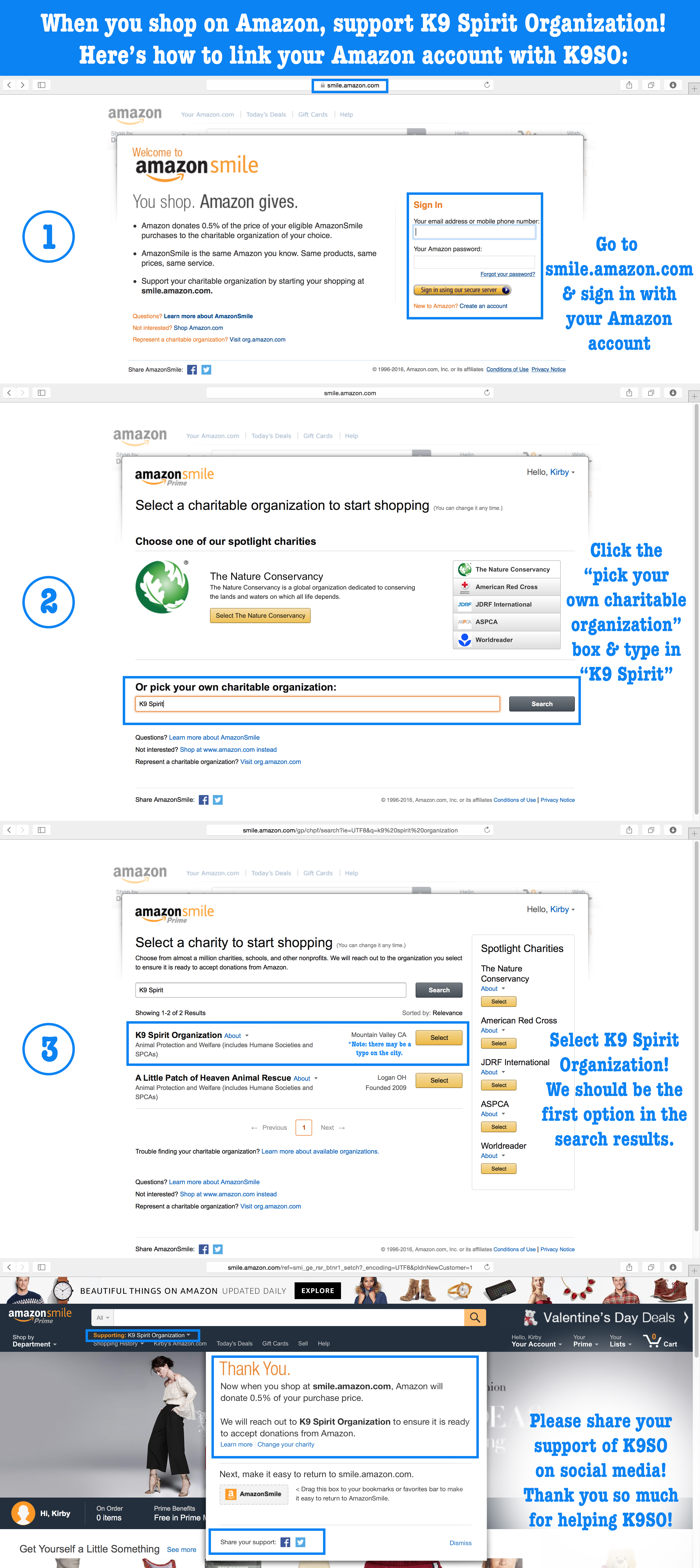 When shopping on Amazon, use smile.amazon.com and a portion of your purchase will be donated to K9 Spirit Organization. Make sure to always make your Amazon purchases through the AmazonSmile website.